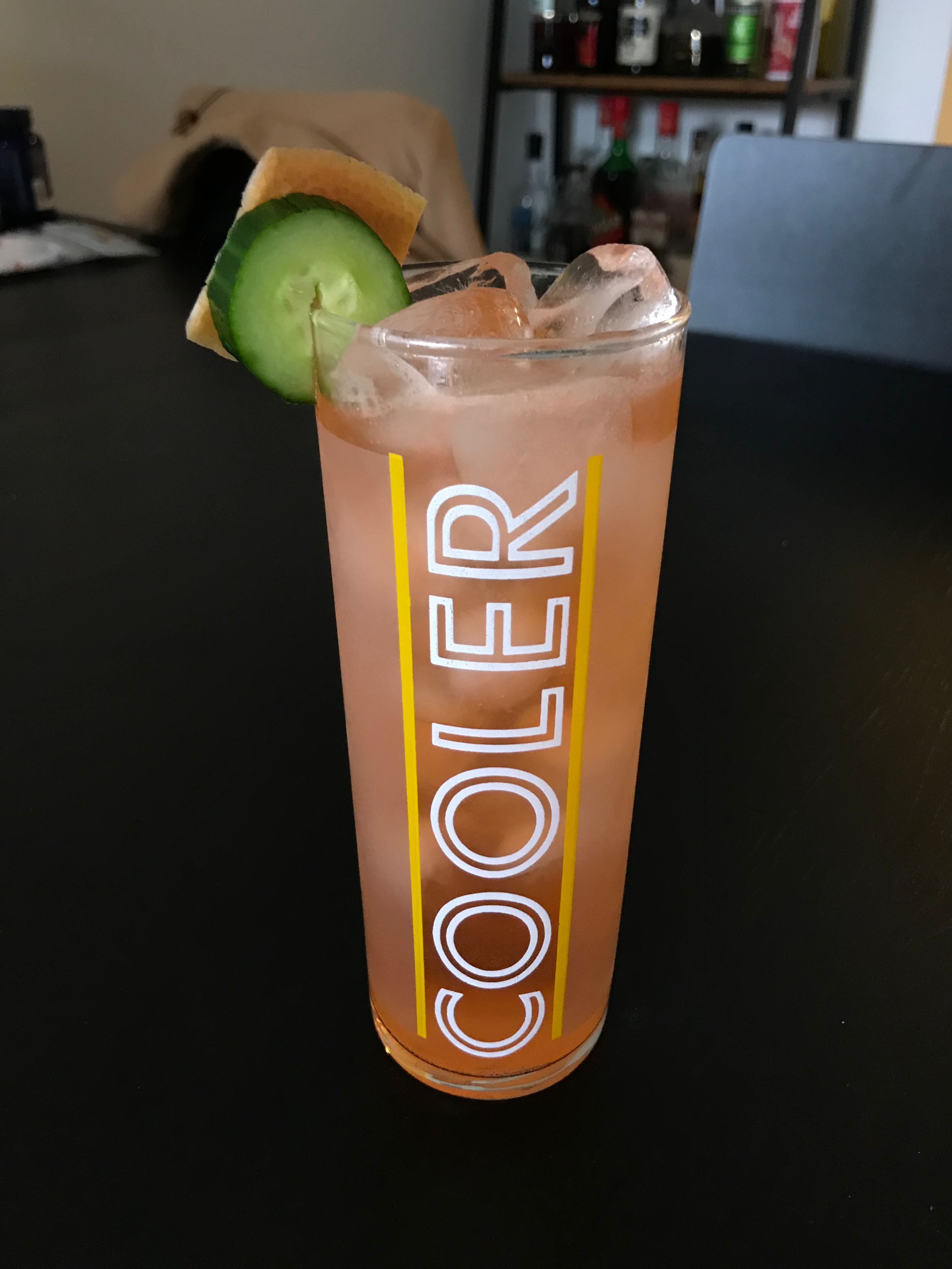 Shake with ice, then strain into a collins glass filled with ice. Garnish with a cucumber wheel and a piece of grapefruit peel.
